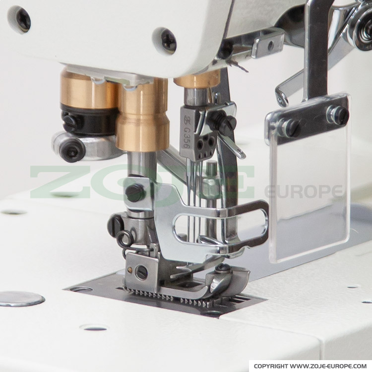 ZOJE C5000-356-02 to 3-igłowy, 5-nitkowy interlok z płaskim łożem, wyposażony w transport dolny różnicowy i automatyczne pozycjonowanie igieł. Maszyna znana też jako kapówka albo renderka.